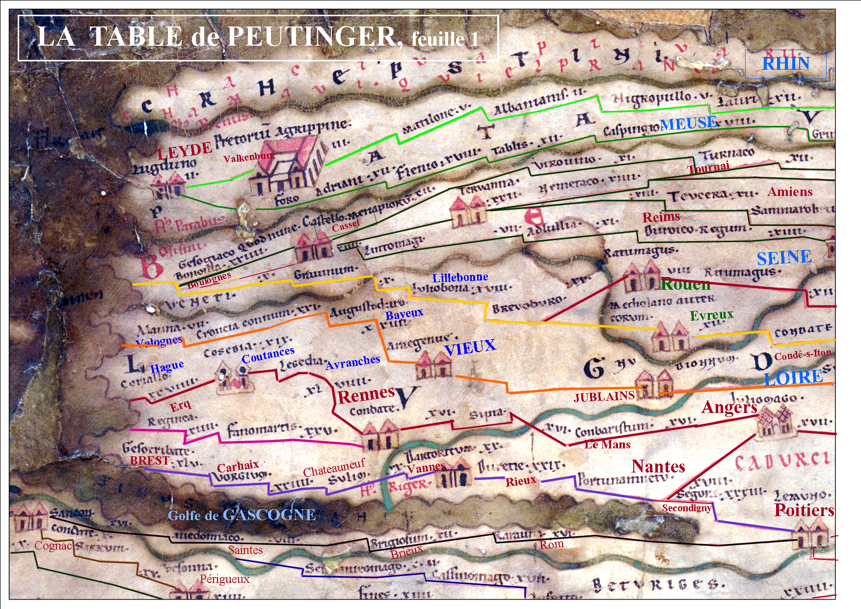 Cette carte contient quelques erreurs et inexactitudes... On peut voir sur cet extrait Rotomagus (Rouen) à l'ouest de Ritumagus. Il y a une erreur d'orthographe, le géographe a écrit Ratumagus. Ritumagus qui est à côté sur la carte est aujourd'hui Radepont dans la vallée de l'Andelle. C’est Roto-magus, le champ de courses ou marché à roue(s) qui a donné Rouen et le Roumois. Certaines localités sont citées plusieurs fois (Condate), des cités importantes sont effacées (Jublains), le vocable «Chrétienté» n’apparaîtra que vers 800 après JC avec Charlemagne… La «Table de Peutinger» semble être en réalité une compilation de plusieurs cartes anciennes.